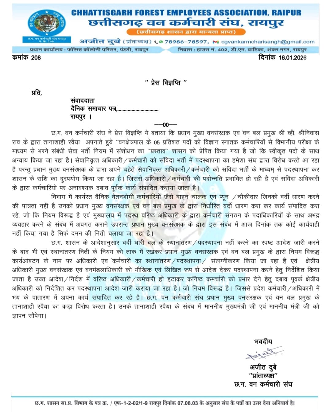 वन कर्मचारी संघ का आरोप: पीसीसीएफ वी.श्रीनिवास राव का रवैया तानाशाही : सेवा नियमों में बदलाव और संविदा नियुक्तियों पर संघ ने जताया विरोध